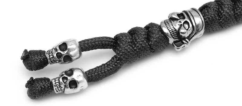 Темляк плетёный с тремя бусинами в форме черепа серебристого цвета. Шнур изготовлен из черного нейлона. Благодаря темляку нож удобно доставать, при диагональном хвате он удлиняет рукоять, а так же служит балансиром для большей управляемости ножа.Плетение: "змейка"