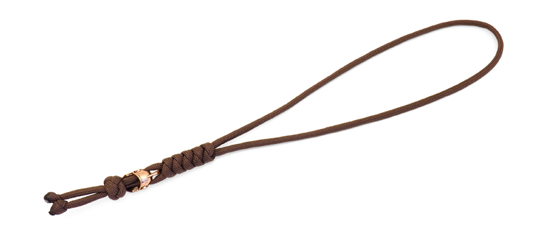 Темляк плетёный с бусиной в форме шлема гладиатора ,бронзового цвета. Шнур изготовлен из коричневого нейлона. Благодаря темляку нож удобно доставать, при диагональном хвате он удлиняет рукоять, а так же служит балансиром для большей управляемости ножа.