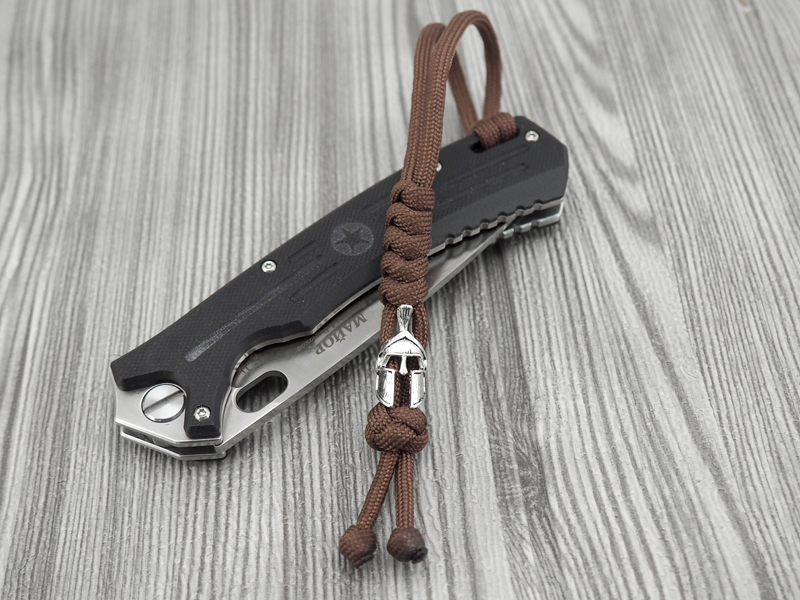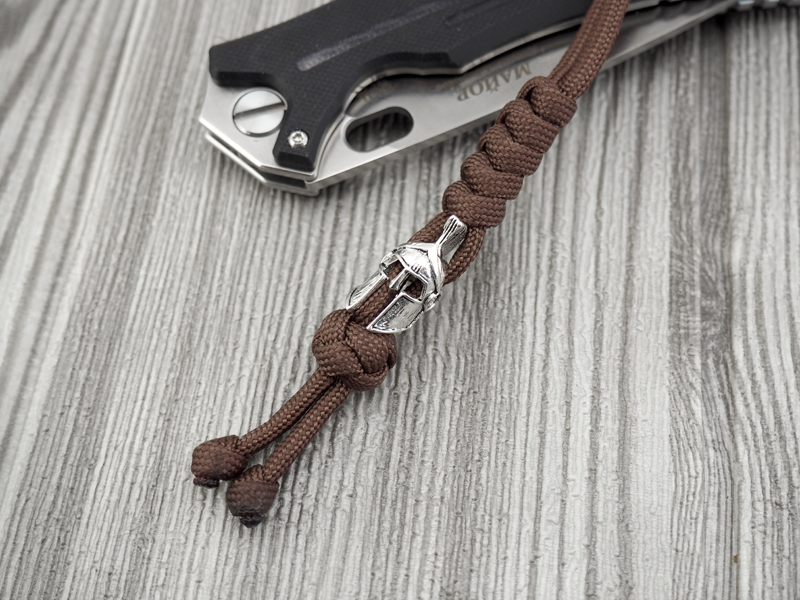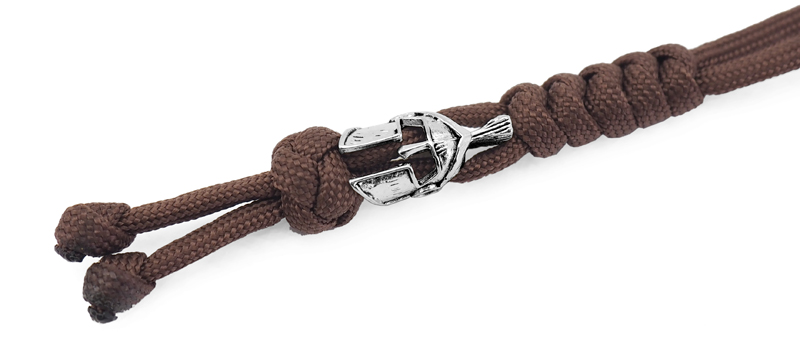 Темляк плетёный с бусиной в форме шлема гладиатора серебристого цвета. Шнур изготовлен из коричневого нейлона. Благодаря темляку нож удобно доставать, при диагональном хвате он удлиняет рукоять, а так же служит балансиром для большей управляемости ножа.Плетение: "змейка"