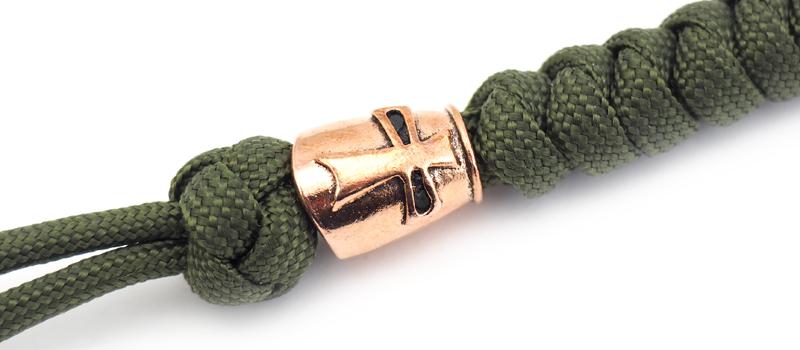 Темляк плетёный с бусиной в форме шлема крестоносца бронзового цвета. Шнур изготовлен из зеленого нейлона. Благодаря темляку нож удобно доставать, при диагональном хвате он удлиняет рукоять, а так же служит балансиром для большей управляемости ножа.Плетение: "змейка"