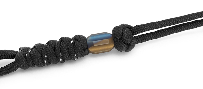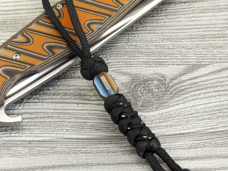 Темляк плетёный с пятигранной титановой бусиной серого цвета. Плетение выполнено из двух нейлоновых шнуров черного цвета толщиной 4мм и 2мм. Благодаря темляку нож удобно доставать, при диагональном хвате он удлиняет рукоять, а так же служит балансиром для большей управляемости ножа.Плетение: "змейка"