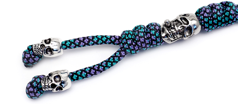 Темляк плетёный с тремя бусинами в форме черепа серебристого цвета. Шнур изготовлен из цветного нейлона. Благодаря темляку нож удобно доставать, при диагональном хвате он удлиняет рукоять, а так же служит балансиром для большей управляемости ножа.