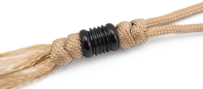 Темляк плетёный с бусиной черного цвета. Шнур изготовлен из бежевого нейлона. Благодаря темляку нож удобно доставать, при диагональном хвате он удлиняет рукоять, а так же служит балансиром для большей управляемости ножа.Плетение: "змейка"