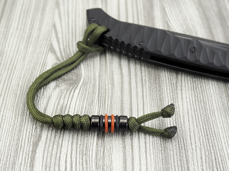 Плетёный темляк с тремя бусинами черного цвета и резиновыми кольцами черного и оранжевого цветов. Шнур изготовлен из зеленого нейлона . Благодаря темляку нож удобно доставать, при диагональном хвате он удлиняет рукоять, а так же служит балансиром для большей управляемости ножа.