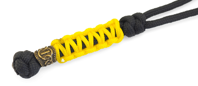 Двухцветный плетёный темляк с бусиной бронзового цвета. Центральный шнур изготовлен из черного нейлона, а оплетка типа "кобра" из более тонкого желтого шнура . Благодаря темляку нож удобно доставать, при диагональном хвате он удлиняет рукоять, а так же служит балансиром для большей управляемости ножа.Плетение: "змейка"