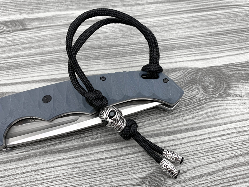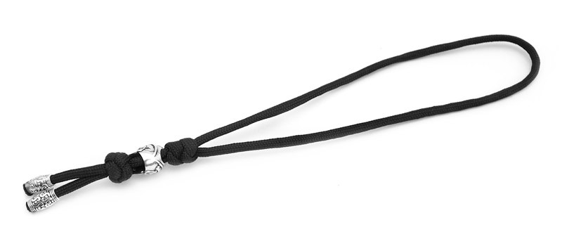 Темляк плетёный с серебряной бусиной в форме черепа. Шнур изготовлен из черного нейлона. Благодаря темляку нож удобно доставать, при диагональном хвате он удлиняет рукоять, а так же служит балансиром для большей управляемости ножа.Плетение: "змейка"