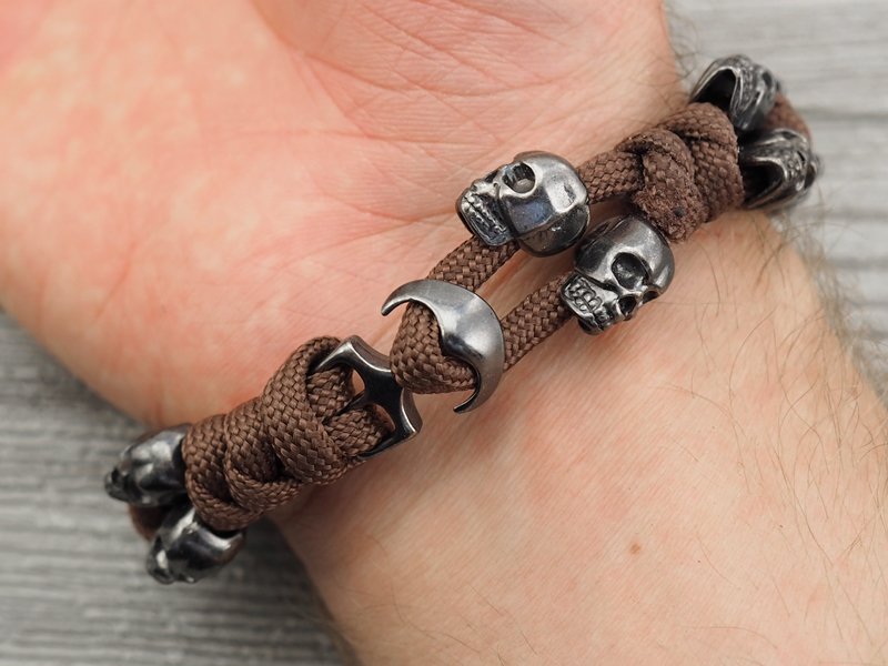Плетеный браслет из коричневого паракорда с вплетенными черными бусинами в форме черепа и черным якорем-застежкой. Длина браслета 19см, общая длина - 21см