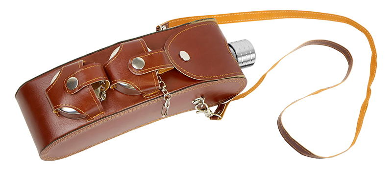 Фляга походная 770 мл в кожаном чехле с двумя стаканчиками и воронкой. Винтовая крышка плотно закрывает горловину и обеспечивает надежную защиту от протекания.Не указан форум для отзывов.