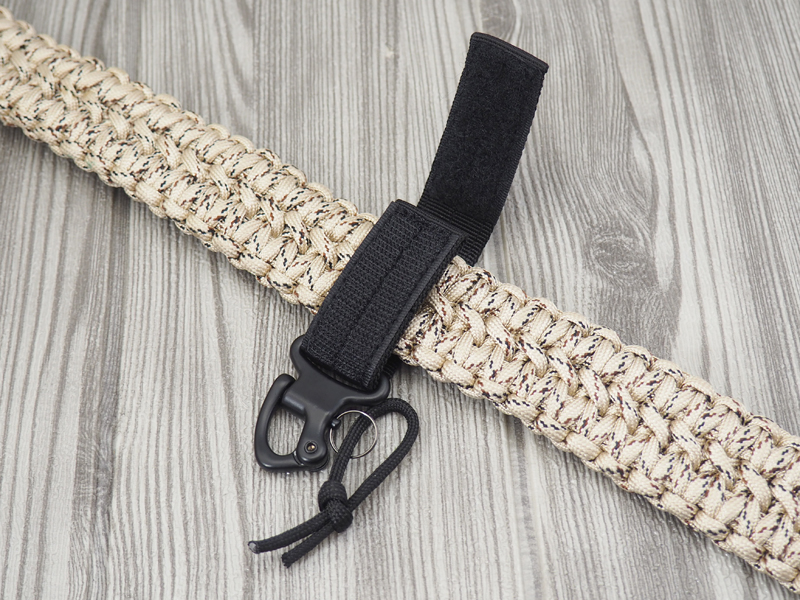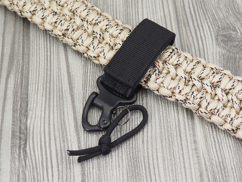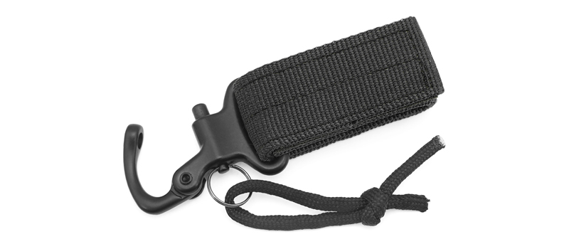 Универсальный карабин-подвес, в комплекте с заводным кольцом. Карабин изготовлен из алюминиевого сплава и предназначен для крепления различных вещей (например, связки с ключами, подсумка, пистолетного шнура или бутылки с водой) на элементах снаряжения или ремне. Для крепления используется гибкий подвес из нейлоновой стропы, черного цвета, с застежкой "велкро" (липучкой). Подвес может быть расположен на стропах «молле» или ремне, шириной до 40мм. Размеры:Длина : 92 мм