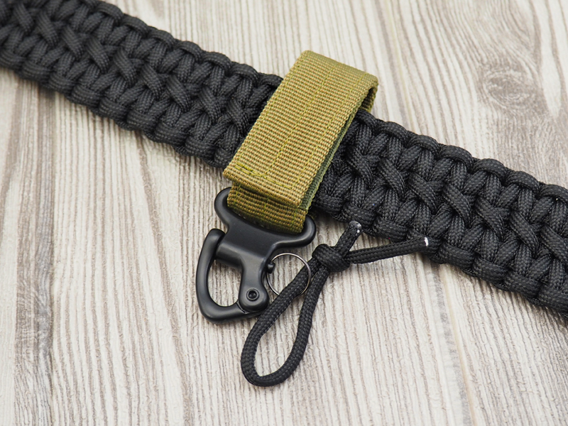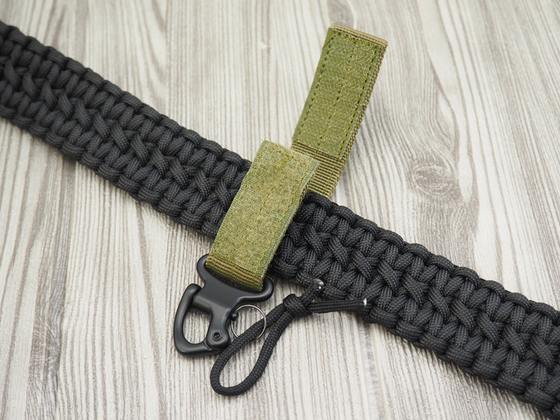 Универсальный карабин-подвес, в комплекте с заводным кольцом. Карабин изготовлен из алюминиевого сплава и предназначен для крепления различных вещей (например, связки с ключами, подсумка, пистолетного шнура или бутылки с водой) на элементах снаряжения или ремне. Для крепления используется гибкий подвес из нейлоновой стропы, черного цвета, с застежкой "велкро" (липучкой). Подвес может быть расположен на стропах «молле» или ремне, шириной до 40мм. Размеры:Длина : 92 мм