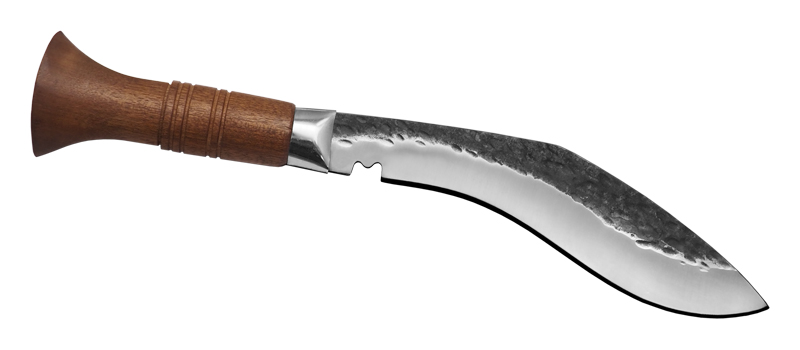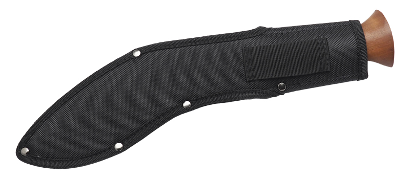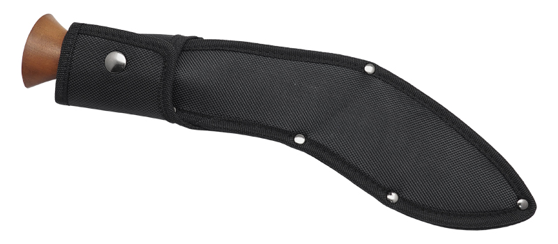 Кхукри, выполненный в традиционном стиле. Он пришёл к нам из Непала и давно завоевал симпатии туристов и путешественников как многоцелевой полевой инструмент. Клинок выполнен из кованой стали и хорошо сбалансирован. Он прекрасно рубит, хорошо режет и сохраняет возможность наносить акцентированные уколы. В крайнем случае нож может использоваться как небольшая лопатка. Деревянная рукоять симметрично расширяется к навершию. Она кажется нарочито простой, но такая простота проверена временем и служит столь же эффективно, как и продукты высокотехнологичного дизайна. Нож снабжён прочными ножнами из нейлона с удобным подвесом.