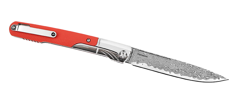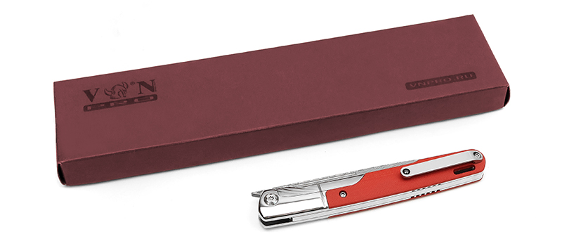 Городской фолдер от компании «VN Pro». Клинок типа «drop-point» изготовлен из многослойной дамасской стали, сочетающей в себе прочность и коррозионную стойкость, закалён до твёрдости 58-60 HRC. Обработка клинка - травление. Замок «liner-lock» надёжно фиксирует клинок в раскрытом положении. Клинок легко открывается одним движением с помощью фронт флиппера. Осевой узел собран на керамических подшипниках, которые обеспечивают плавное и лёгкое раскрытие клинка. Удобная рукоять имеет накладки из износостойкого композита G10. Клипса переставляемая, поэтому нож удобен и для левшей. Стильный и современный, он станет отличным подарком!Не указан форум для отзывов.