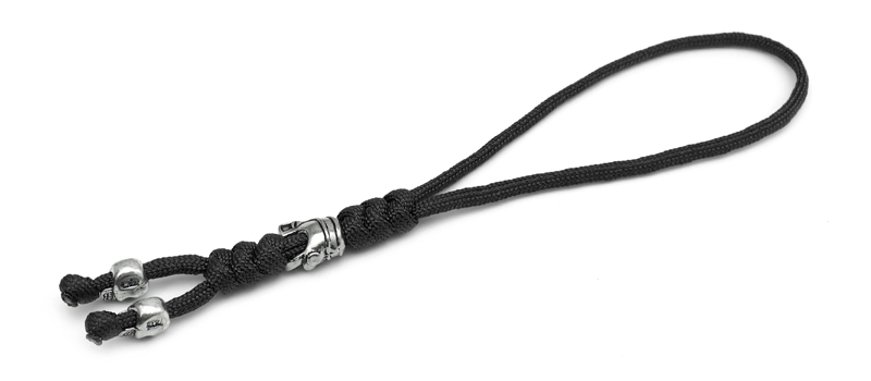 Темляк плетёный с тремя бусинами в форме черепа серебристого цвета. Шнур изготовлен из черного нейлона. Благодаря темляку нож удобно доставать, при диагональном хвате он удлиняет рукоять, а так же служит балансиром для большей управляемости ножа.Плетение: "змейка"
