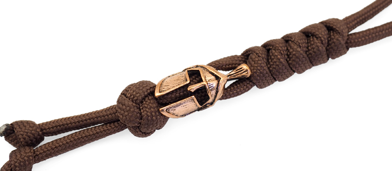Темляк плетёный с бусиной в форме шлема гладиатора ,бронзового цвета. Шнур изготовлен из коричневого нейлона. Благодаря темляку нож удобно доставать, при диагональном хвате он удлиняет рукоять, а так же служит балансиром для большей управляемости ножа.