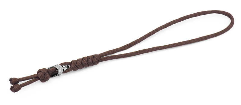 Темляк плетёный с бусиной в форме шлема гладиатора серебристого цвета. Шнур изготовлен из коричневого нейлона. Благодаря темляку нож удобно доставать, при диагональном хвате он удлиняет рукоять, а так же служит балансиром для большей управляемости ножа.Плетение: "змейка"