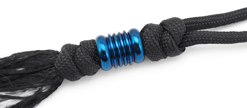Темляк плетёный с бусиной синего цвета. Шнур изготовлен из черного нейлона. Благодаря темляку нож удобно доставать, при диагональном хвате он удлиняет рукоять, а так же служит балансиром для большей управляемости ножа.Плетение: "змейка"