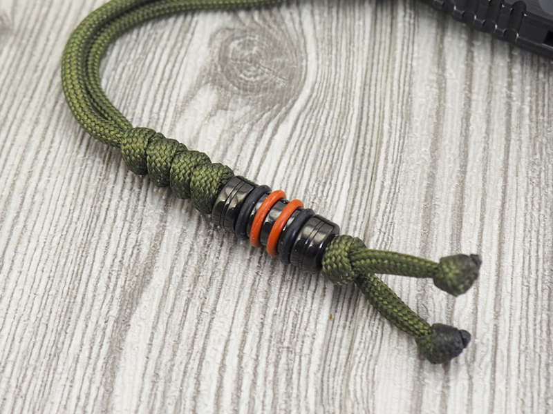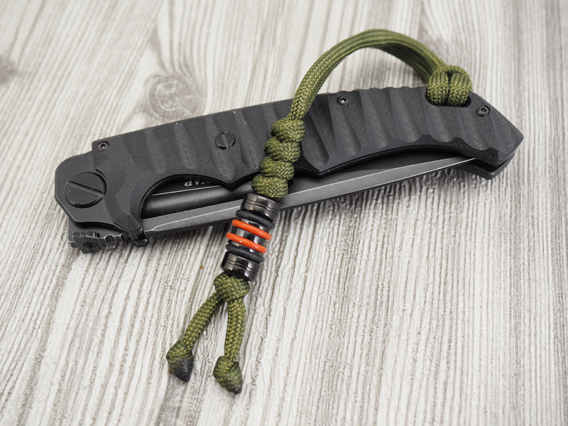 Плетёный темляк с тремя бусинами черного цвета и резиновыми кольцами черного и оранжевого цветов. Шнур изготовлен из зеленого нейлона . Благодаря темляку нож удобно доставать, при диагональном хвате он удлиняет рукоять, а так же служит балансиром для большей управляемости ножа.