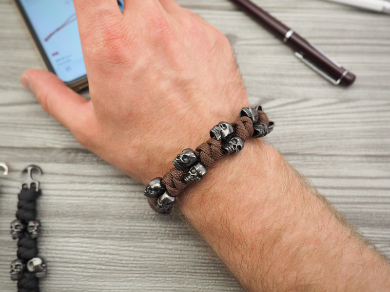 Плетеный браслет из коричневого паракорда с вплетенными черными бусинами в форме черепа и черным якорем-застежкой. Длина браслета 19см, общая длина - 21см