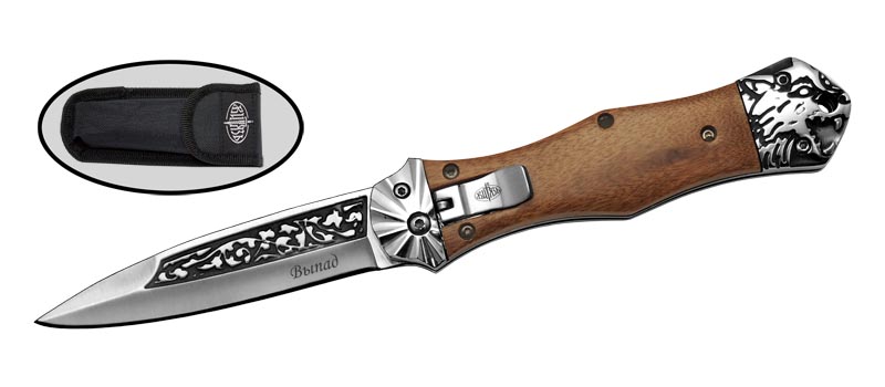 «Выпад» - автоматический нож с боковым извлечением клинка. Он прочен, эффективен, сделан из надежной стали. Однако при том красив, металлические части украшены лаконичным декором. Деревянные накладки рукояти обработаны влагозащитной пропиткой и не боятся сырости. Также следует обратить внимание на замок «Lever Lock». Он крайне надёжен, механизм никогда не сработает сам по себе, и ваши пальцы всегда останутся в безопасности. При этом замок позволяет открывать и закрывать нож одной рукой без усилий. Отличный выбор для ценителей ножей-автоматов. «Выпад» укомплектован нейлоновыми ножнами.Не указан форум для отзывов.