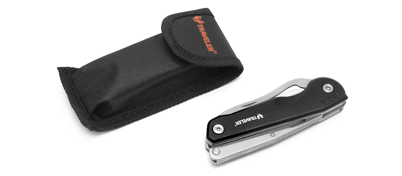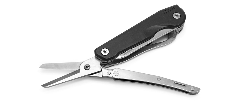 Оригинальный и практичный мультитул. Вместо традиционных плоскогубцев он имеет ножницы, которые зачастую оказываются намного практичнее. Длина в раскрытом виде 182 мм, сам клинок 77 мм. В набор помимо клинка из нержавеющей стали входят небольшая пила, шлицевая отвертка, консервный нож, открывалка для бутылок и гаечный ключ. Рукоять металлическая, с защитным покрытием. Нож поставляется в чехле из нейлона и картонной коробке. Вес инструмента без чехла 170 г.Не указан форум для отзывов.